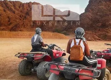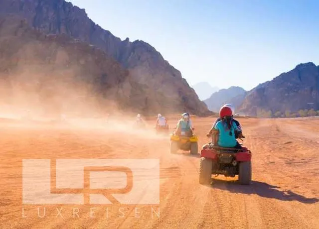 Embark on an unforgettable quad bike safari in Hurghada! Ride through golden desert dunes at sunset, explore a traditional Bedouin village, and savor a delicious BBQ dinner under the starry sky.